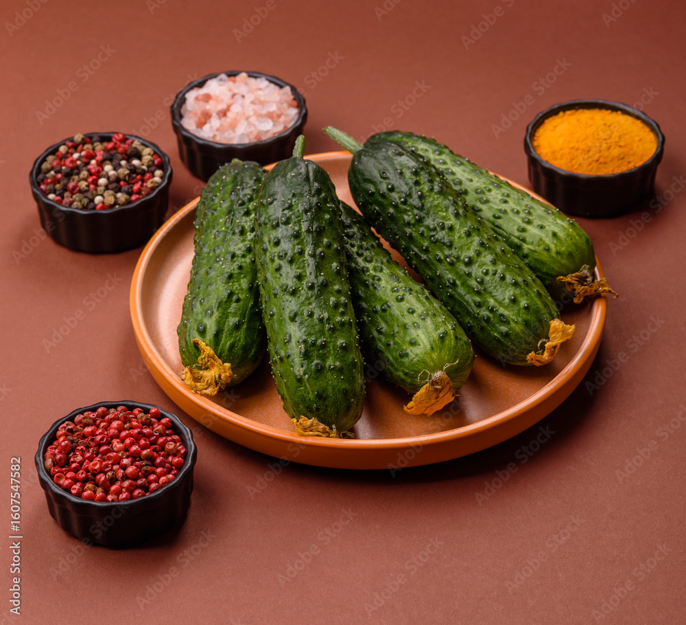 Fresh raw whole cucumbers, an ingredient for preparing salads and vegetarian dishes. Green fresh cucumbers