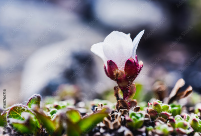Close-up white arctic flower on the island of Svalbard Spitsbergen in the city of Longyearbyen in summer