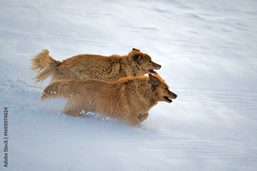 two Golden Retriever running together side by side on snowy meadow.