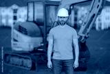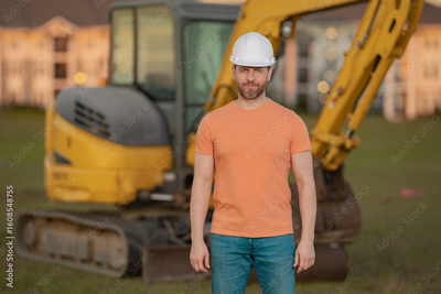 Worker at construction site. Builder constructor in hardhat. Construction man with helmet. Worker at construction with helmet. Industry worker at construction building. Builder at site building with