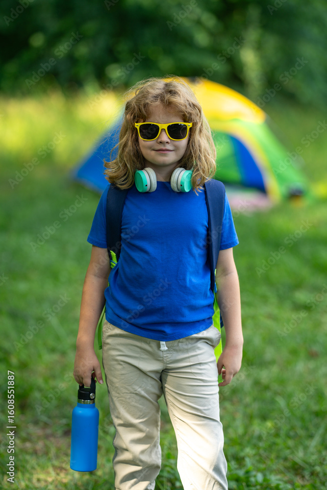 Kid exploring nature outdoors. Child hiking in the forest. Kid on camping. Kid with backpack on a nature trail. Little explorer with camping gear. Hiking. Child exploring nature at camp.