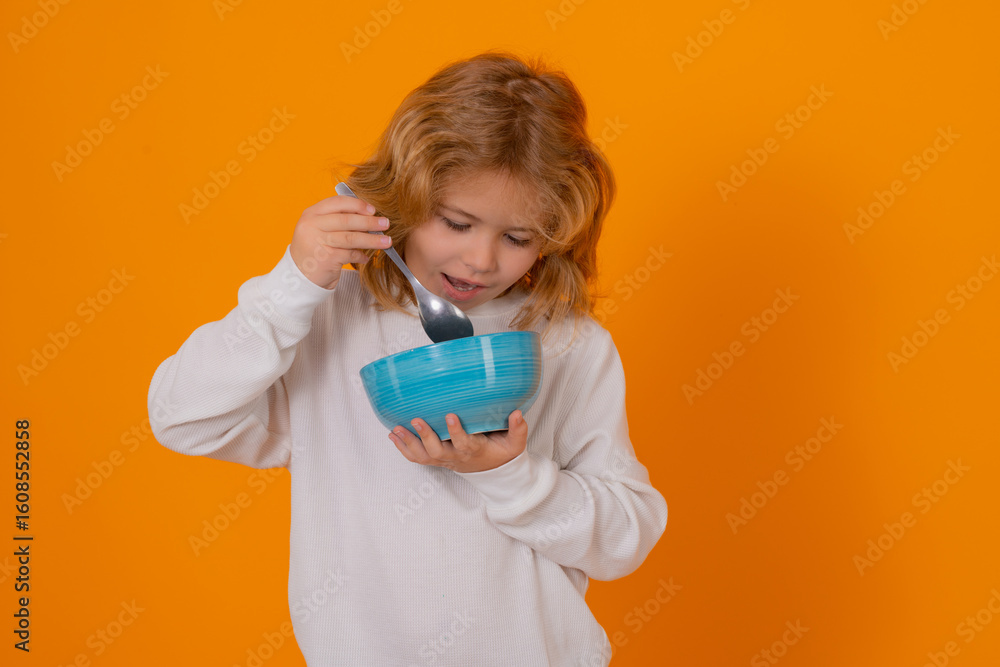 Child eating breakfast with spoon and bowl. Funny boy enjoying tasty dairy product. Kid holding cup of organic food. Portrait of child with healthy meal. Young boy eating fresh food. Healthy meal for