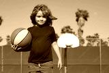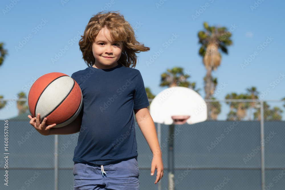 Child playing basketball on outdoor court. Happy child boy hold basketball ball. Summer sport kids. Kid on basketball game. Sporty kid training basketball on playground. Outdoor activity for children.