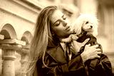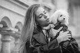 Woman hugging fluffy puppy outdoors. Girl playing with cute bolognese dog. Young woman holding small white dog. Fluffy puppy. Girl cuddling her domestic doggy. Smiling woman with cute dog outdoor.