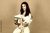 Beautiful sensual woman hold bouquet of flowers, studio portrait.