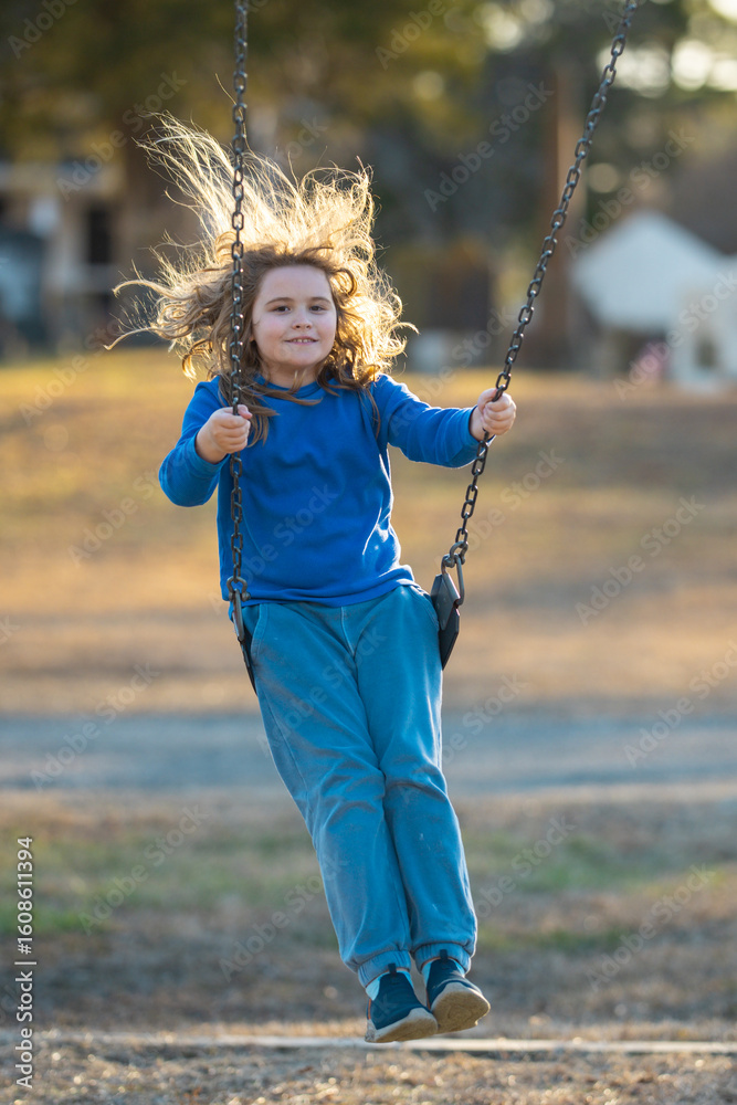 Excited child enjoying a fun ride. Happy kid on playground. Carefree child swinging in the air. Happy children play outside. Young boy swinging with excitement. Playful kid outdoor. Funny child face.