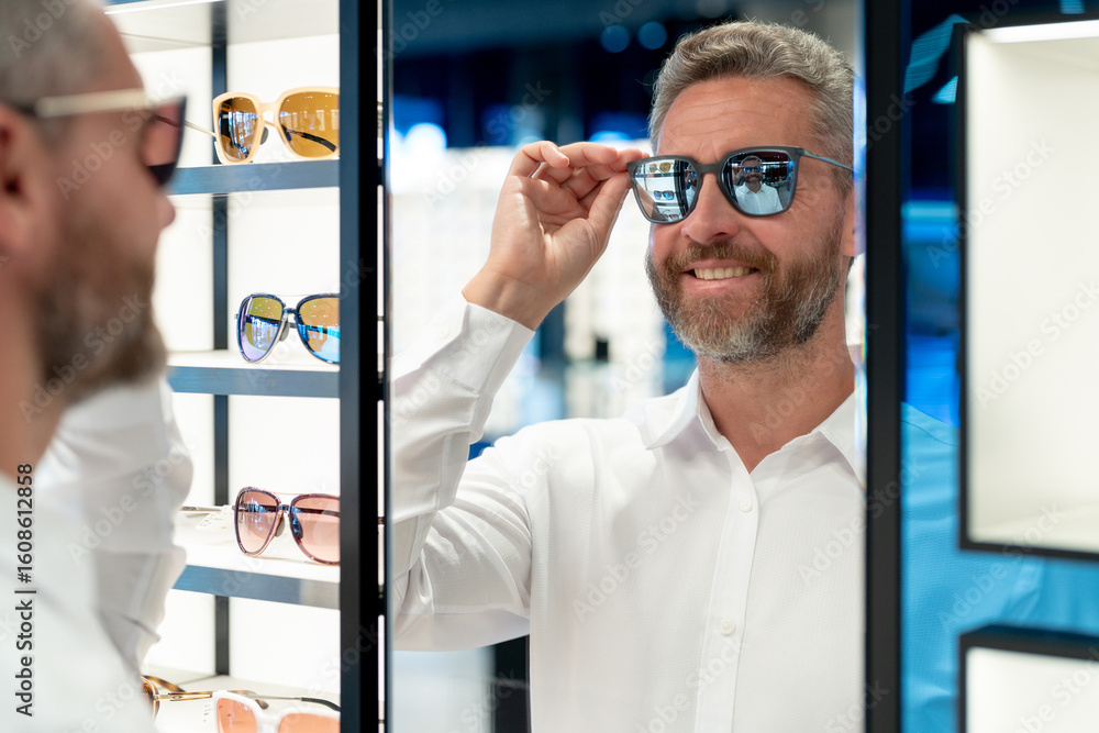 Man in sunglasses indoors portrait. Mature guy choosing eyeglasses. Fashion man in trendy eyewear. 40s man buying sunglasses. Customer trying glasses. Man in sunglasses boutique.