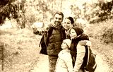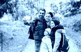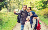 family with backpacks taking selfie by smartphone