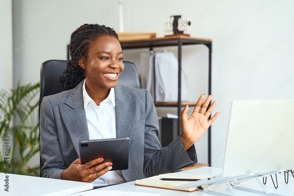 Professional Businesswoman Conducting Online Meeting, Smiling and Waving, Using Tablet in Modern Office Workspace