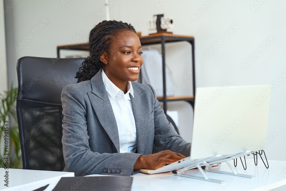 Professional Businesswoman In Office Attire Using Laptop, Smiling And Working Confidently In A Modern Workspace, Showcasing Productivity, Professionalism, And Workplace Success.