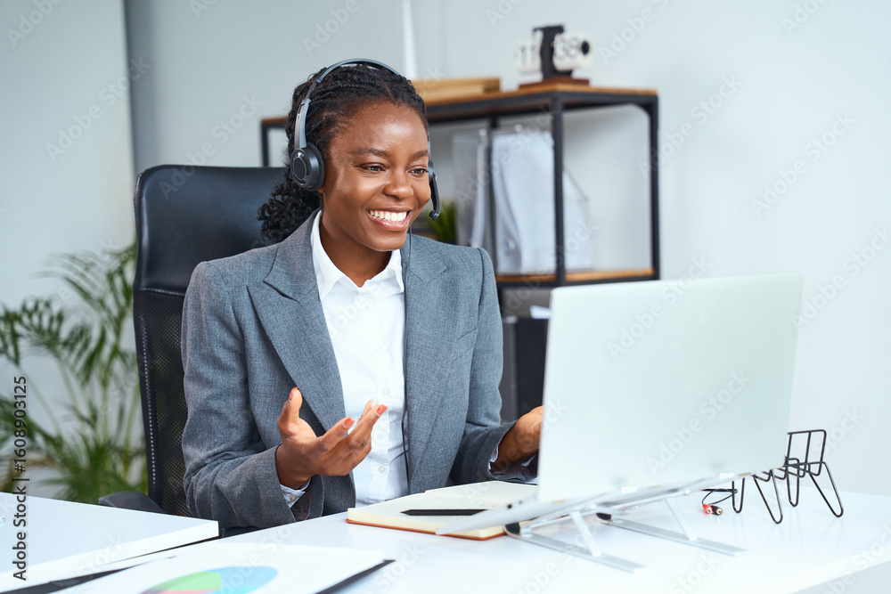 Professional Woman Wearing Headphones Conducting Virtual Meeting On Laptop, Discussing Business With Smile And Confidence, Modern Office Background Providing Optimal Remote Work Environment.