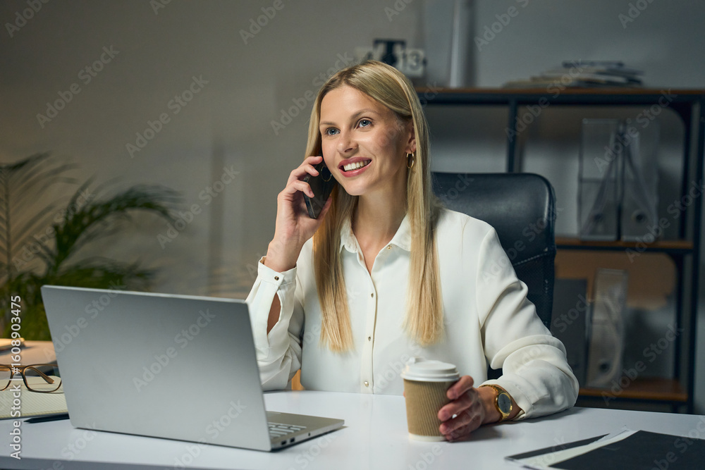 Professional businesswoman speaking on the phone while working on her laptop at the desk. The office space conveys productivity, modern professional life, and success. Ideal for business, workplace.