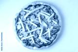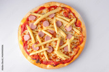 Italian pizza with fresh tomato sauce, melted mozzarella, sausages, crispy fries, and anchovies, captured from above on a white background.