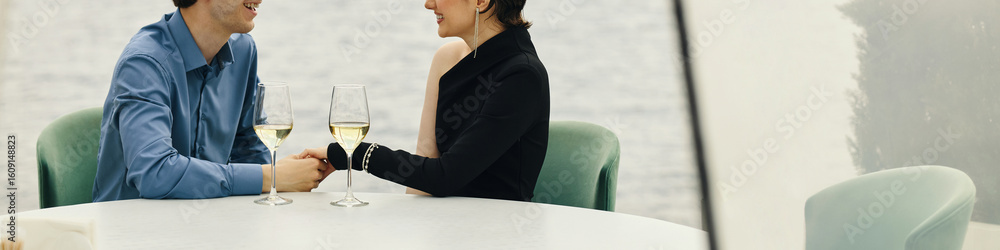 Young Caucasian man and young Caucasian woman sitting at round table holding hands and smiling at each other, drinking wine, enjoying romantic moment outdoors near water