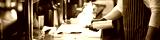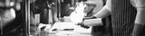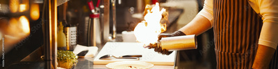 Caucasian young adult man using culinary torch to caramelize food in professional kitchen, wearing apron and gloves, preparing dish with visible flames, partial body visible