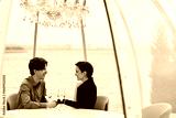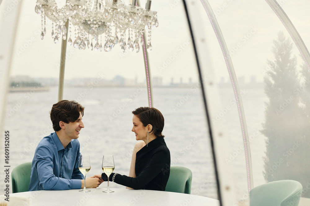 Caucasian young man and Caucasian young woman sitting at round table by waterfront, holding hands and smiling at each other while drinking wine in elegant setting