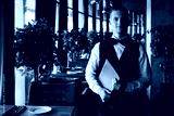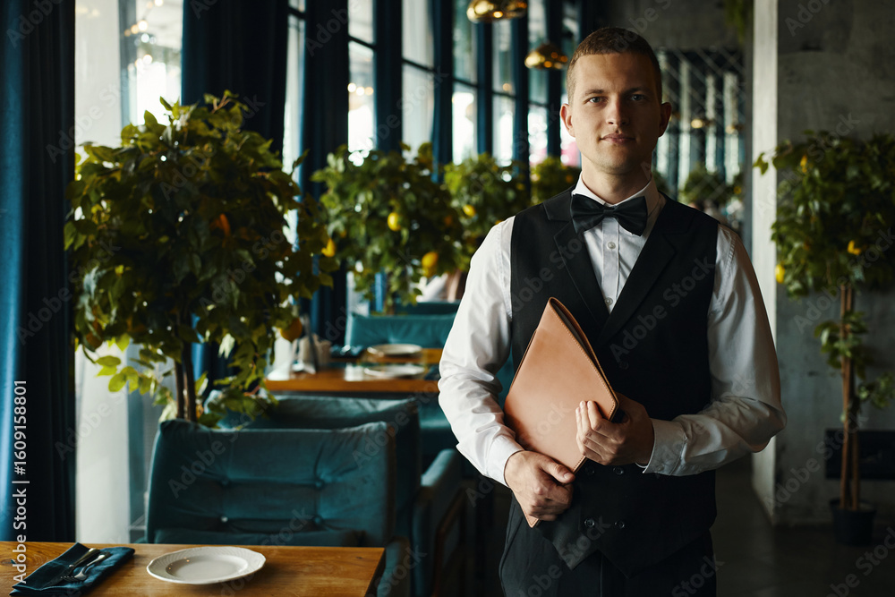 Portrait of young adult Caucasian man standing in restaurant, holding menu folder wearing formal vest and bow tie looking at camera with neutral expression indoor