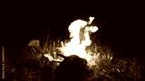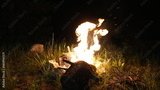 Warm flames dancing in darkness, illuminating surrounding grass and ground. Natural evening outdoor scene with burning wood logs creating atmospheric light and warmth in wilderness setting
