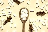 White tablets, vitamins, pills and green leaf in wooden spoon on blue background top view. Medical pharmaceutical background, health concept, organic dietary supplements, self care