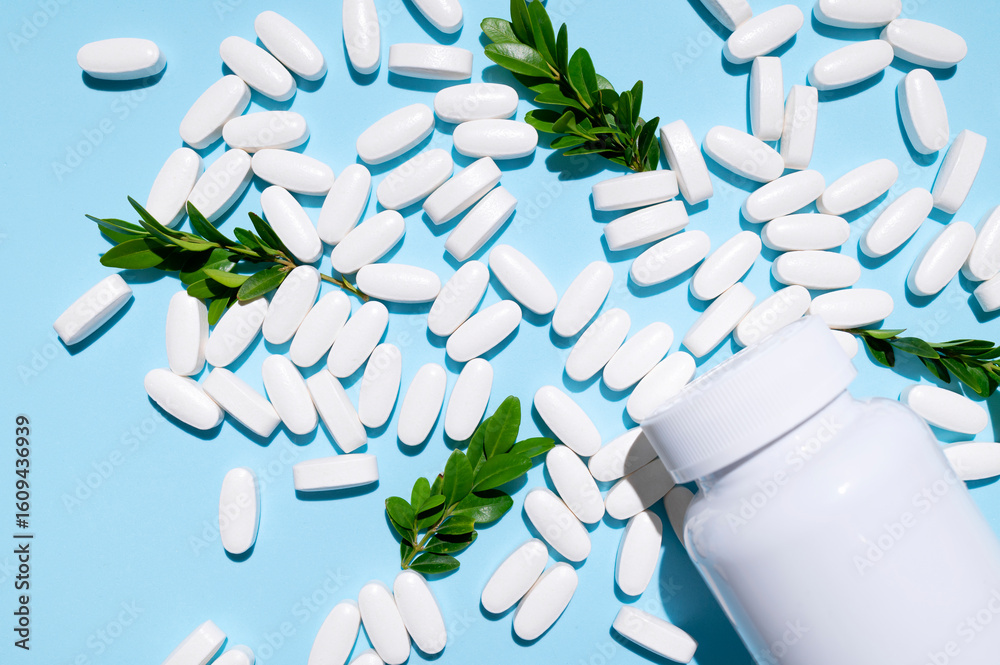 White container, plastic packaging and scattered white tablets, vitamins, pills, food supplements on blue background top view. Medical and pharmaceutical concept, health concept