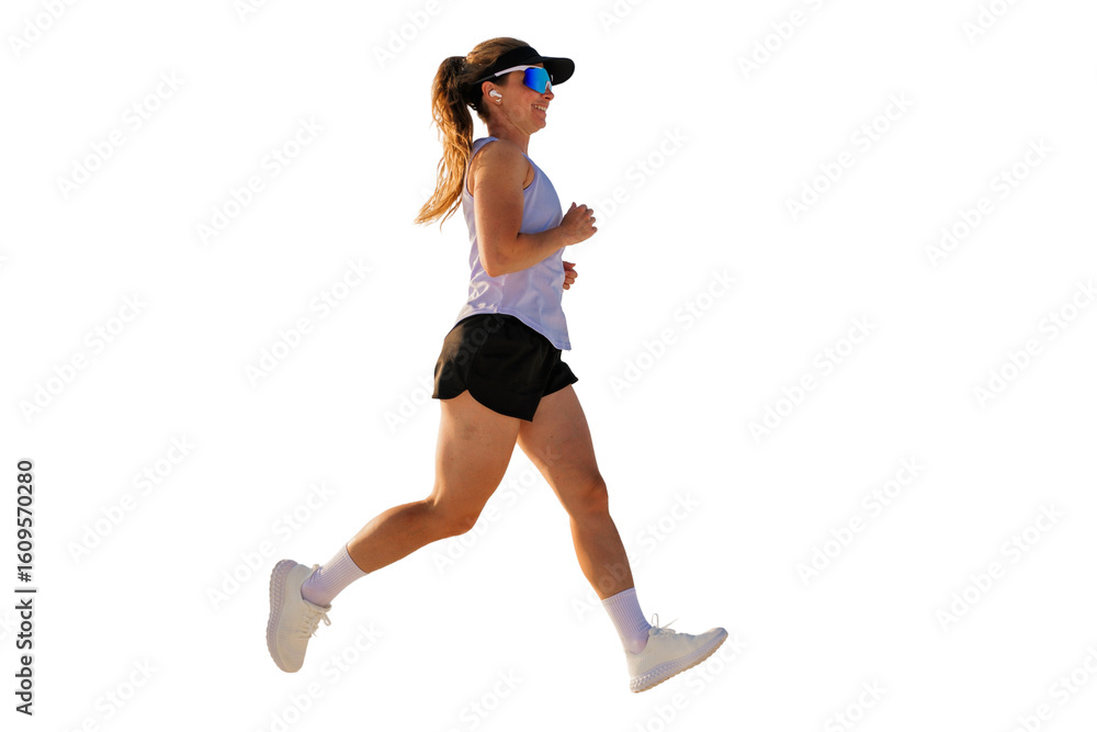 Woman enjoying a vibrant run in athletic wear, transparent background.
