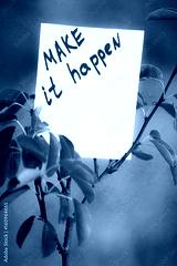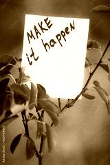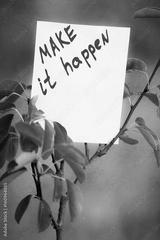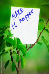 Motivating phrase make it happen. On a green background on a branch is a white paper with a motivating phrase.