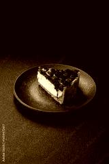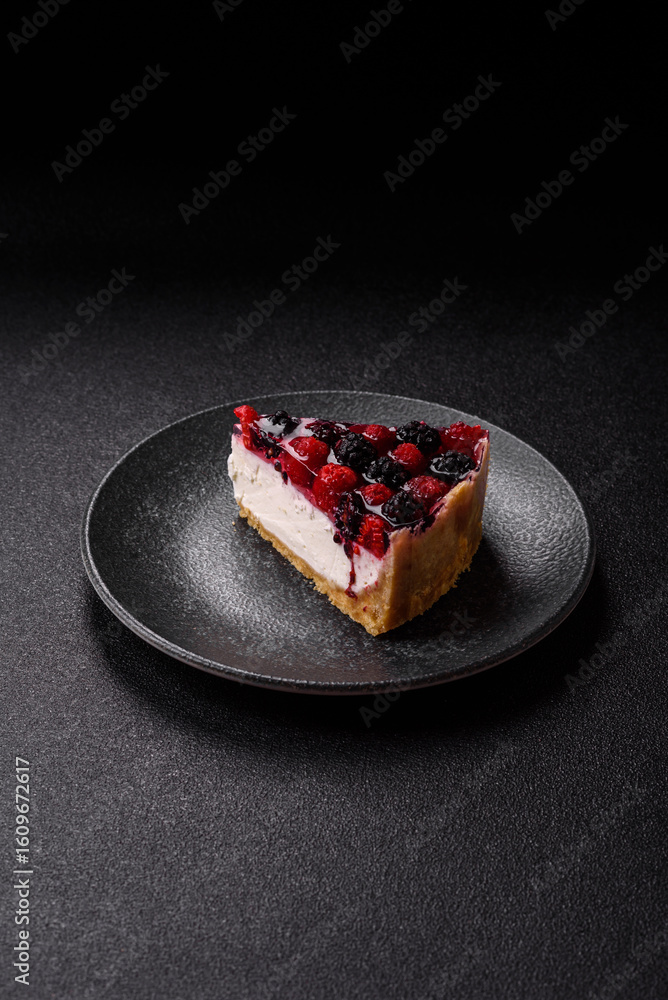 Pie, cheesecake with raspberries and blackberries, mascarpone cheese. Piece of cheesecake