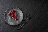 Pie, cheesecake with raspberries and blackberries, mascarpone cheese. Piece of cheesecake