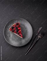 Pie, cheesecake with raspberries and blackberries, mascarpone cheese. Piece of cheesecake