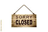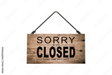 Sorry, we are closed. White sign with shadow isolated on transparent background. Realistic vector illustration. Business concept for closed businesses, sites and services. Signboard with a rope.