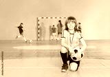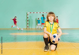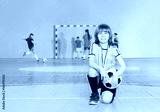 Soccer team captain standing on knee in futsal
