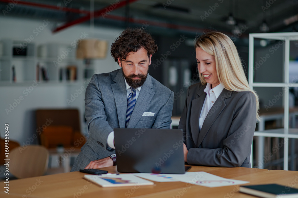 Business colleagues collaborating on laptop analyzing financial data in modern office