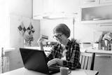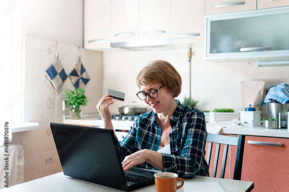 Shopping online. Middle-aged woman buying remotely from home kitchen. Happy senior consumer using credit card, laptop for payment. Finances on retirement, mindful spending. Technology lifestyle