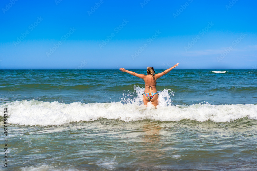 Beautiful mature woman enjoying bathing in sea in summertime. Back view