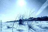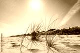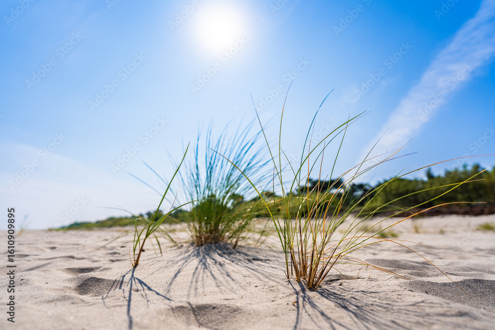 Close-up of beautiful white sand and grasses growing on sunny beach