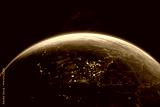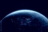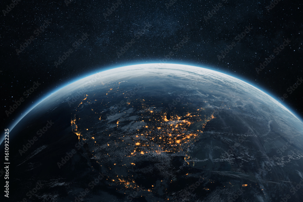 Night view of Earth from space, showing illuminated cities like New York, Washington, Atlanta, and Chicago. Stunning North America lights under a starry sky.