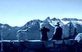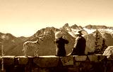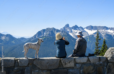 Couple and their dog enjoying the beautiful views at Sunrise Trail. Mt Rainier National Park. Washington State.