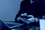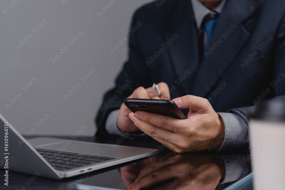 businessman uses a smartphone at a desk with a laptop, signifying digital communication, mobile banking, or online networking. Perfect for modern business and connectivity.