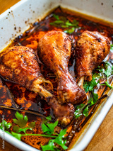 Crispy baked chicken drumsticks in baking dish on wooden table