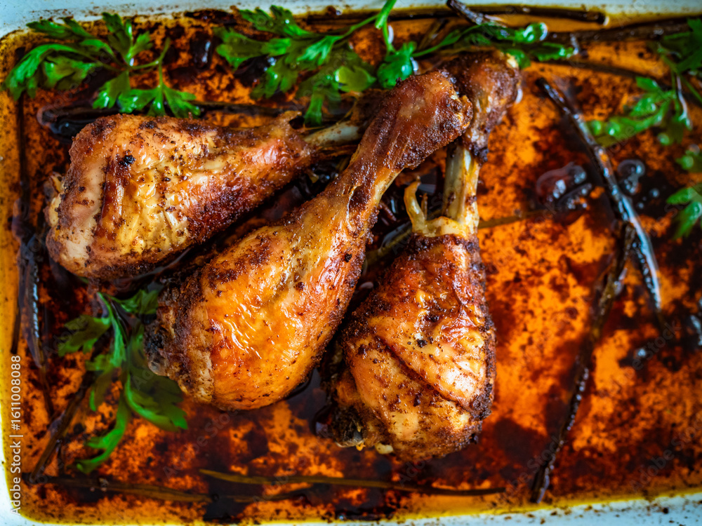 Crispy baked chicken drumsticks in baking dish on wooden table