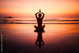 The silhouette of a woman in a seated yoga pose on the shore, reflected in the wet sand beneath a surreal pink-red sunset. The sky and sea melt into one, creating a dreamlike scene.