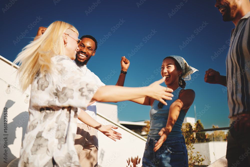 Group of diverse friends dancing together on rooftop terrace