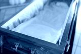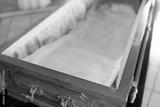 close up of open empty coffin in church