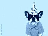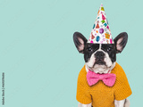 Cute puppy and party hat. Close-up, indoors. Studio shot, cut out, isolated background. Congratulations for family, relatives, loved ones, friends and colleagues. Pets care concept