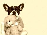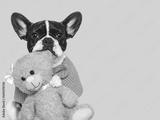 Cute puppy and Teddy bear. Close-up, indoors. Studio shot, isolated background. Congratulations for family, relatives, loved ones, friends and colleagues. Pets care concept
