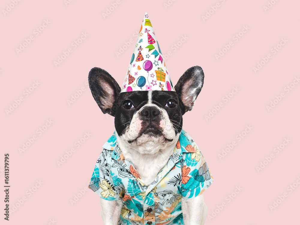 Cute puppy and party hat. Close-up, indoors. Studio shot, cut out, isolated background. Congratulations for family, relatives, loved ones, friends and colleagues. Pets care concept