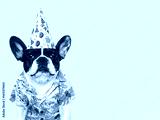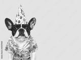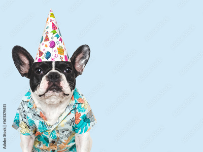 Cute puppy and party hat. Close-up, indoors. Studio shot, cut out, isolated background. Congratulations for family, relatives, loved ones, friends and colleagues. Pets care concept