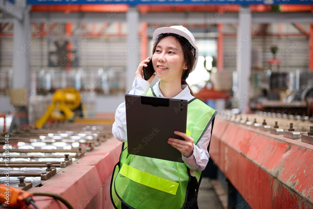 Engineer or worker talking on smartphone and holding a clipboard in the factory