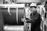 Technician or worker checking a roll of industrial aluminum metal material in the factory
