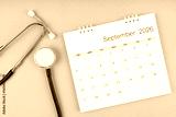 September 2026 desk calendar and stethoscope on blue color, Medical appointment concept.
